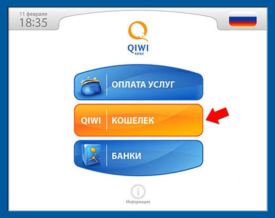 2. На главном экране терминала QIWI нажмите среднюю кнопку «QIWI КОШЕЛЕК»: